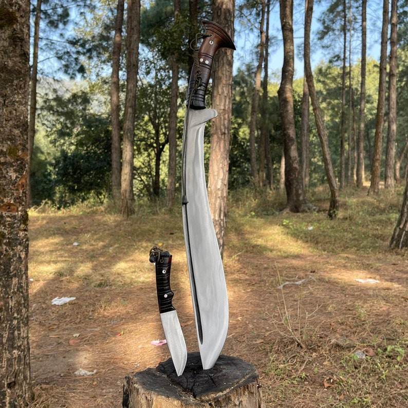 This knife comes complete with a refined leather sheath and includes two small complementary knives—a classic feature in traditional Nepali kukri sets.
