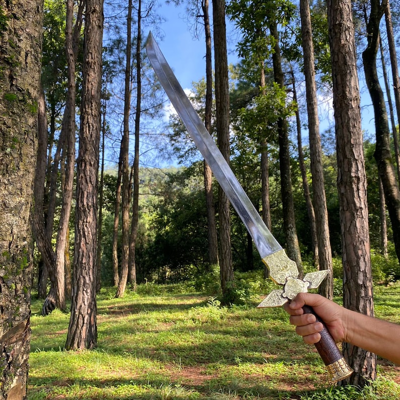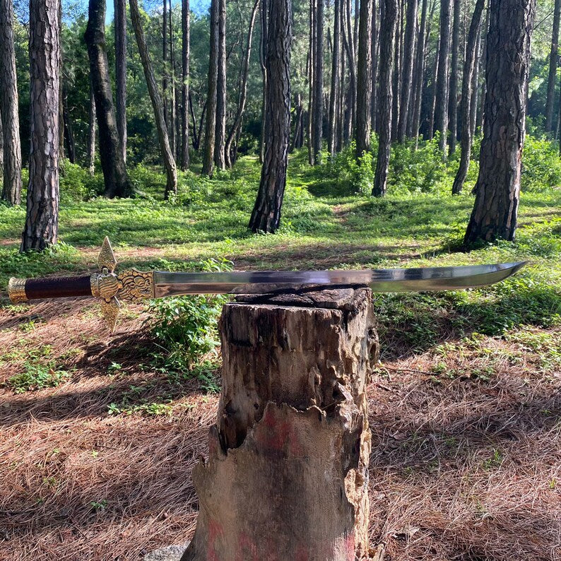 The 8 inch full tang handle is crafted from rich Indian rosewood, featuring beautiful gold-colored carvings for a premium, decorative finish. This sword combines the rugged function of a tactical equipment with the elegance of traditional craftsmanship.