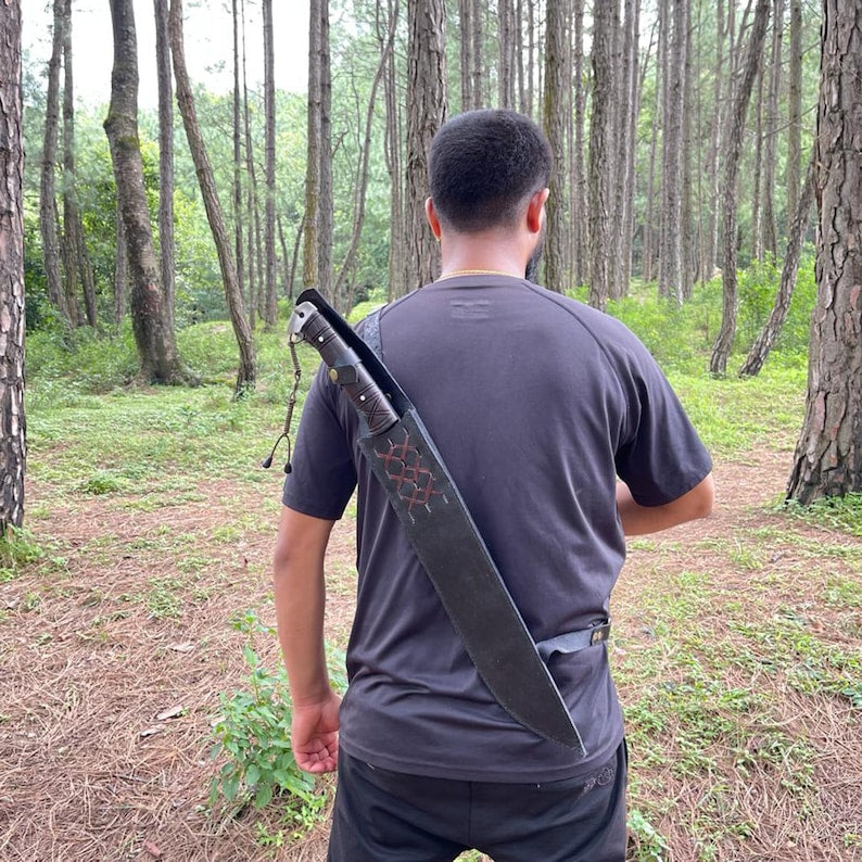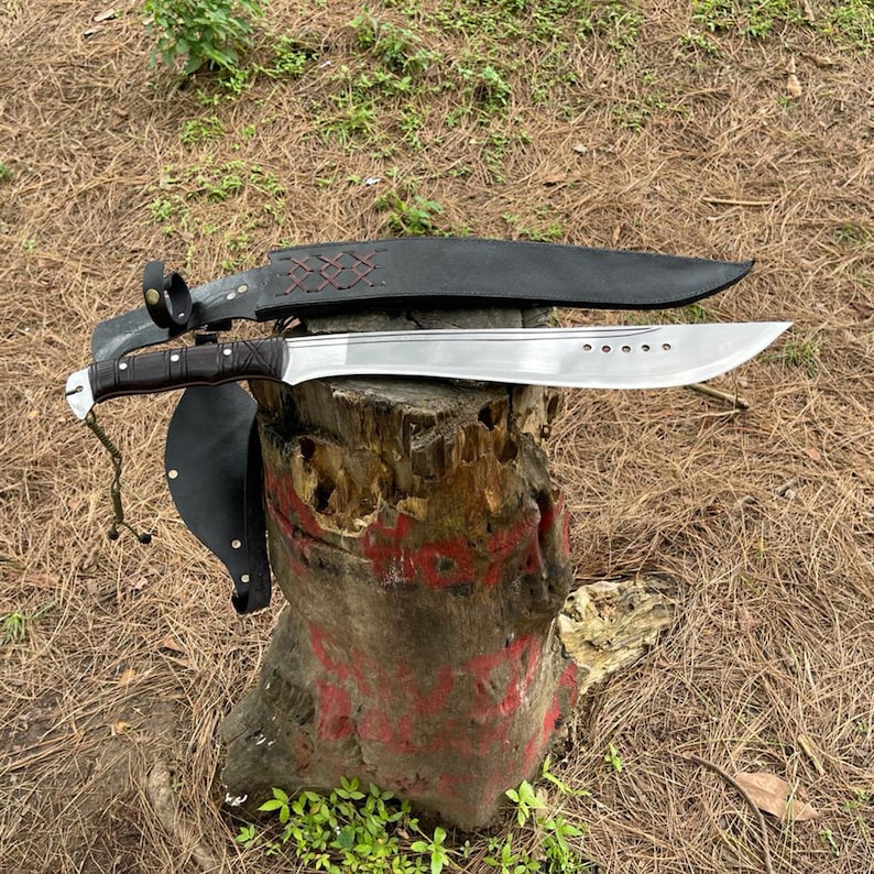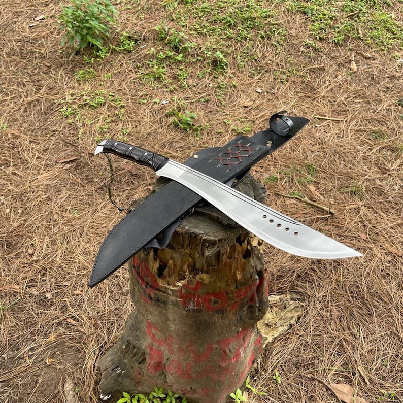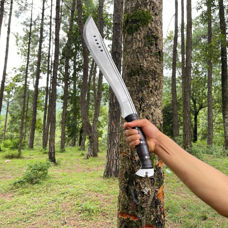 The Book of Eli Machete Kukri Knife is one of the most iconic knives, blending tradition with unique tactical features. This 20-inch hand-forged kukri showcases a hybrid design with holes near the edge and a serrated spine, enhancing both style and function.