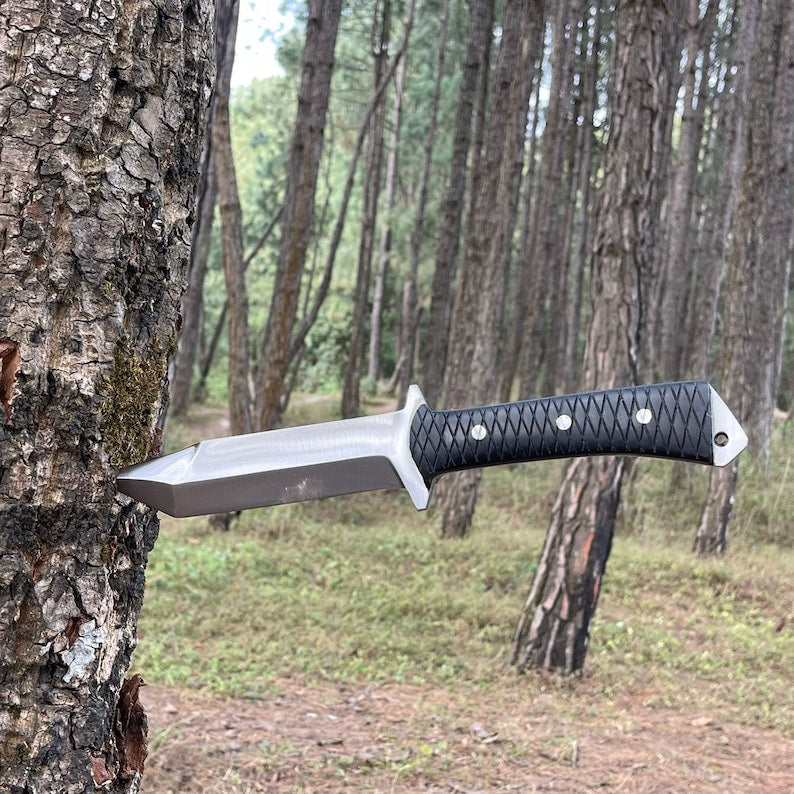 The full tang handle, measuring 6 inches, is made with durable G10 composite—offering a secure and ergonomic grip for outdoor, hunting, or survival tasks. The blade edge is oil-tempered for added strength and flexibility, making it reliable in rugged use.
